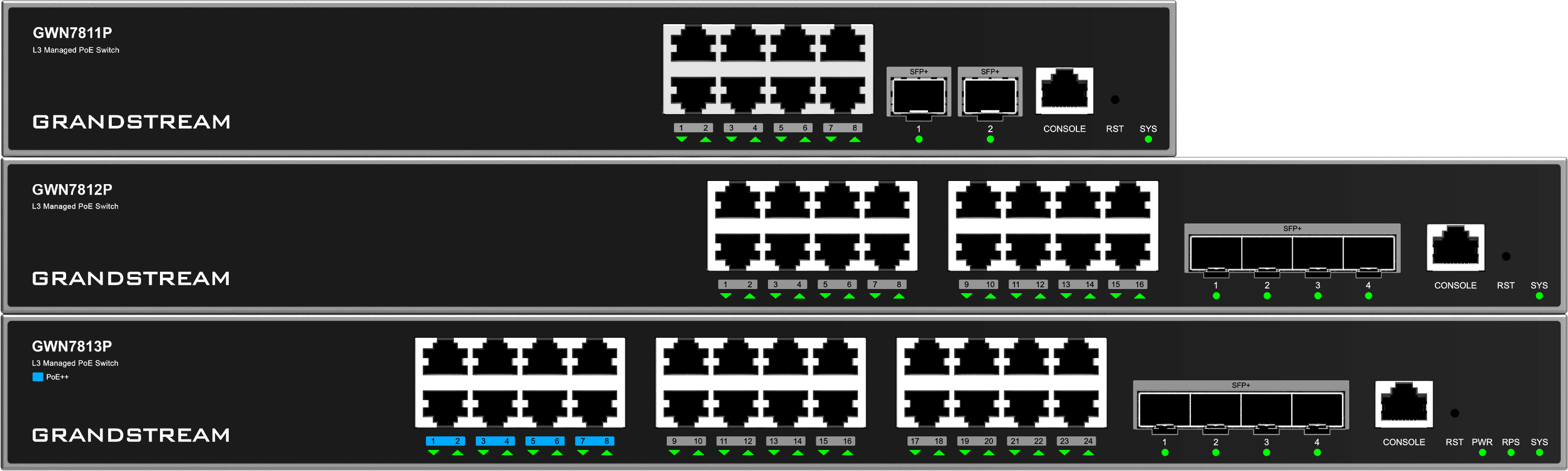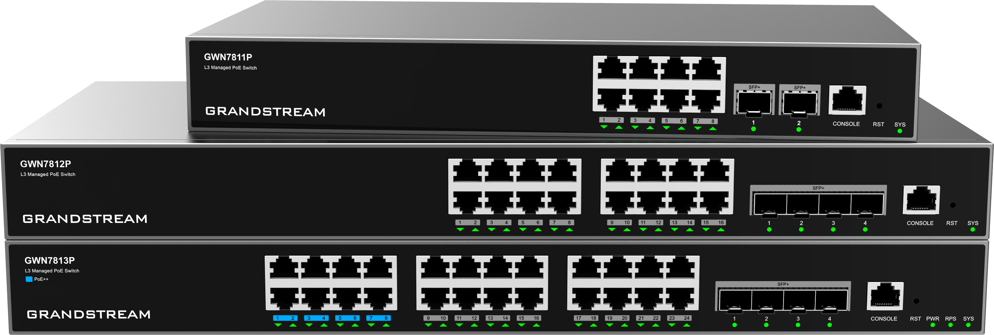 GWN7810シリーズは、中堅から大企業向けに拡張性が高く、セキュアで高パフォーマンスの完全に管理可能なスマートビジネスネットワークを可能にするレイヤー3マネージドネットワークスイッチです。柔軟性があり、洗練されたトラフィックセグメンテーションのためのアドバンスドVLAN、ネットワークトラフィックの優先順位化を実施する先進のQoS、ネットワークパフォーマンスの最適化及び潜在的攻撃に対する包括的なセキュリティ能力のためのIGMP/MLDスヌーピーイングをサポートします。PoE モデルは、IP電話機、IPカメラ、Wi-Fiアクセスポイントとその他のPoE端末に電源を供給するスマートダイナミックPoE出力を提供します。GWN7810シリーズは、 本体スイッチのローカルウェブユーザーインターフェースとCLI(コマンドラインインターフェース)を含む複数の方法で管理可能です 。このシリーズは、またGrandstreamのクラウドとオンプレミスネットワーク管理プラットフォームであるGWNクラウド、 GWNマネージャーによってサポートされています。GWN7810 シリーズは、中堅から大企業のビジネス向けの最上級のエンタープライズグレード管理ネットワークスイッチです。
