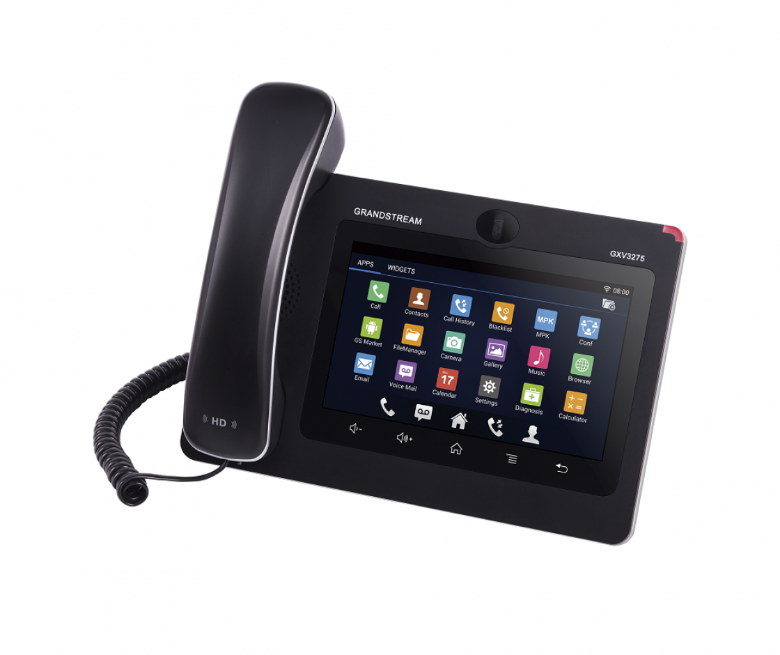 GXV3275は、パワフルな音声やビデオ、マルチメディアビジネスコミュニケーションを提供するAndroid™ 向けのIPテレビ電話機。職場での連絡や最新情報共有に最適です。この画期的な6回線IP電話機により、ユーザーは職場内および顧客とのコミュニケーションに、音声通話のほか、付属のタブレット状タッチスクリーン(7インチ)を使って、様々なテレビ電話プラットフォーム(Grandstream社の無料IPVideo Talkサービスのほか、スカイプやグーグル・ハングアウトなど、あらゆるAndroidアプリ)を利用できます。このAndroid向けIPテレビ電話機は、SalesForce1,、GoToMeeting、サービスプロバイダーアプリなど、Googleプレイストアの百何十万とあるAndroidアプリが利用できます。さらにヘッドセットや連絡先/カレンダー交換用モバイル機器とのペアリングのための内蔵ブルートゥース、通話転送、ギガビット・ポート、Wifiなど、多彩な機能を備えています。 GXV3275が機能を発揮するのは、IPテレビ電話だけではありません。IP監視や入退室管理ソリューションにも活用できます。サードパーティのドアホン、SIPドア開閉装置やIPカメラに接続することで、ユーザーがこれらの機器をオフィスや自宅からGXV3275を使って制御できます。監視機能として、セキュリティ警告や警報発令またはライブ映像チェックの際に、GXV3275がSIPテレビ電話を通して、IP監視カメラとの双方向の通信をします。
